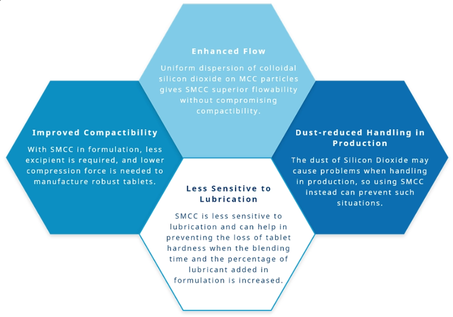 Comprecel® SMCC is a Silicified Microcrystalline Cellulose composed of 98% Microcrystalline Cellulose (MCC) and 2% colloidal silicon dioxide (CSD). By co-processing technology, the CSD is uniformly distributed on the surface of the MCC particle, this uniformity gives SMCC superior flowability without compromising compactibility.