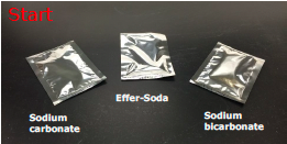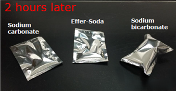 2 Hours Later – Packaging checked for ballooning, you can see there is significant ballooning in the package formulated with sodium bicarbonate alone.