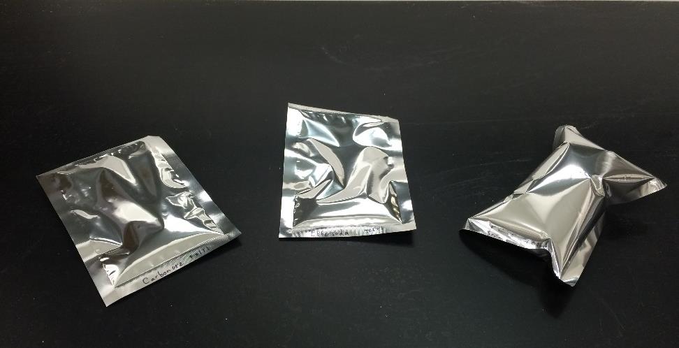 2 Hours Later – Packaging checked for ballooning, you can see there is significant ballooning in the package formulated with sodium bicarbonate alone.