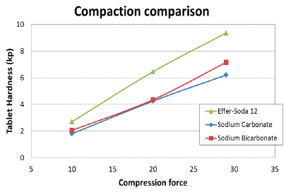 70% Effer-Soda, Sodium carbonate or Sodium bicarbonate; 30% Mannogem EZ; Compacted to 10, 20, and 30 kN; 1000mg tablets compressed using 0.625” FFBE “D” punch on Lloyds Press