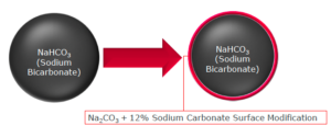 The Effer-Soda manufacturing process ensures that each particle of Sodium Bicarbonate is surface modified with Sodium Carbonate. Each particle must be surface modified to prevent contact of water or hydrated acid with the sodium bicarbonate, in order to avoid premature effervescence in both effervescent tablets and effervescent sachets