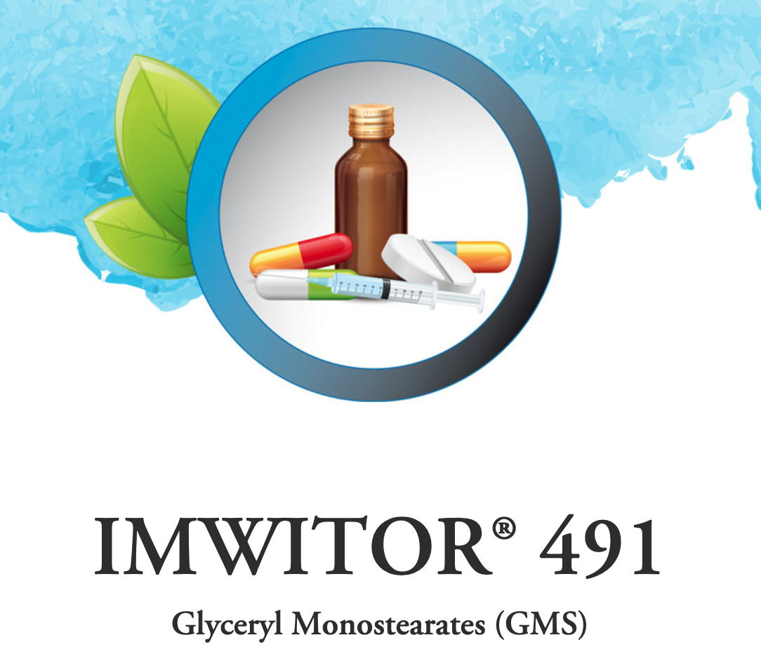 IMWITOR 491 is an ester from the plant fatty acids stearic and palmitic acid with plant derived glycerol. The monoester content is more than 90%. It is manufactured from hydrogenated rape seed oil and glycerol. This ester is a white to slightly yellow, wax-similar powder with a neutral and slightly fatty odour and taste. It is a lipophilic matrix suitable for oral solid dosage forms (granulation, hot melt technique), used as tablet lubricant, O/W co-emulsifier, emulsion stabilizer, stiffening and dispersing agent for pigments.